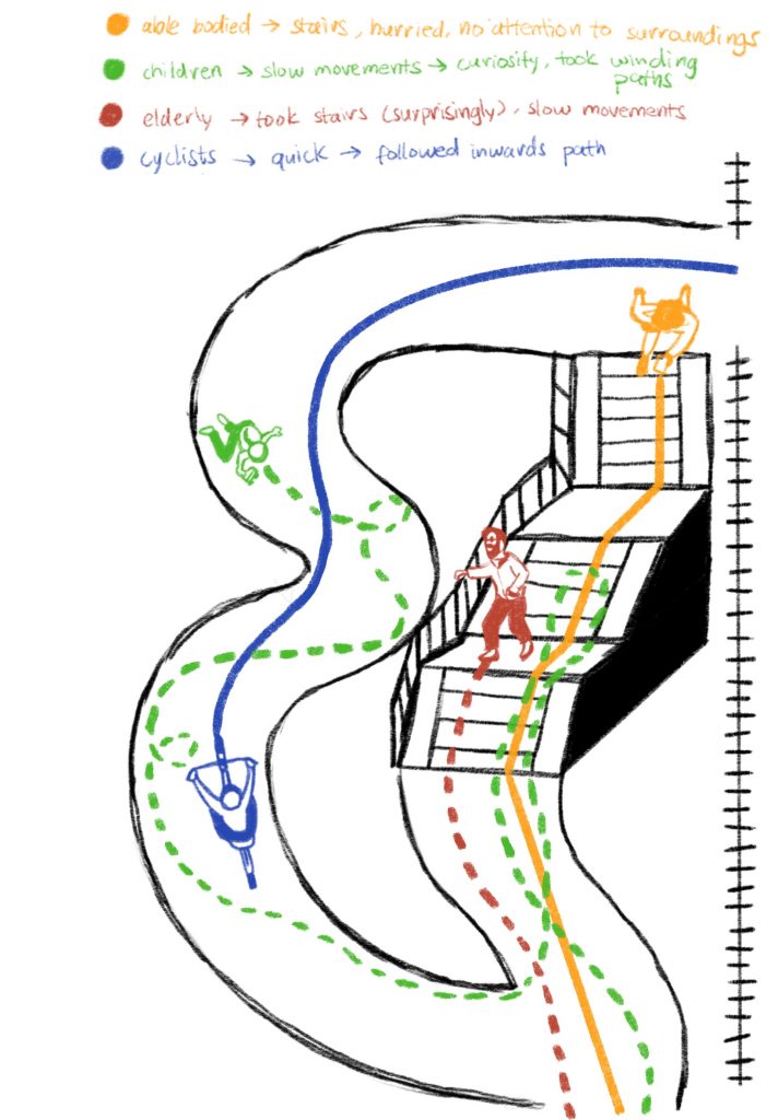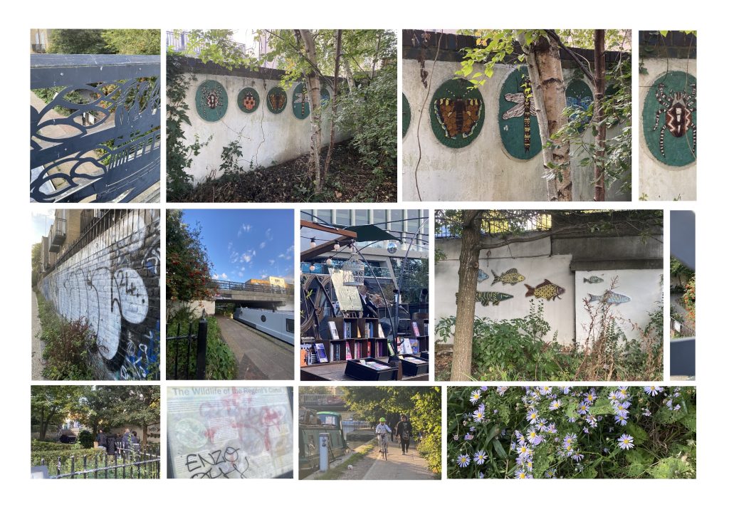 My initial investigation included 4 methods: sketches, collages, photos, and videos. Elements of the site that stood out to me initially were mosaics of the wildlife around the site, the way different people would use the ramp or stairs to enter or exit the canal, and the different sounds around me.